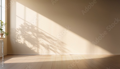 Light on the background wall. Shadow from the window and sunlight. White rays of the sun in a bright empty room. Shade overlay. Modern studio in beige tones. interior of a room with a window