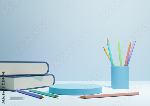 Light, pastel, baby blue 3D illustration back to school product display podium or stand, horizontal image from the side with pencils and books on table for product photography background or wallpaper