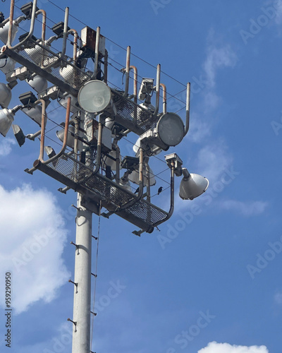 tower, sky, antennae, light, radio, technology, lamp, security, telecom, equipment, broadcast, mast, surveillance, mobile, transmitter, stadium