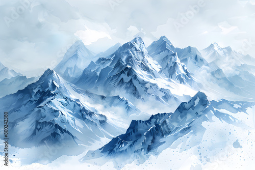 Light watercolor of high mountains. Serene and peaceful landscape with snowy peaks and a blue sky. Ideal for travel and outdoor recreation themes.