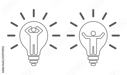 light, bulb, light bulb, icon, person, hands up, idea, man, vector, power, innovation, businessman, illumination, electric, electricity, creative, illustration, symbol, concept, bright, isolated, design, graphic, energy, glasses, electrical, inspiration, technology, drawing, solution, lamp, outline, white, logotype, element, business, signs, web, brainstorm, shine, electronic, fluorescent