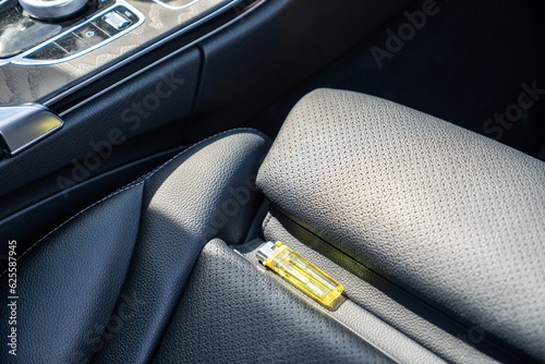 Lighter in car on hot sunny day. High temperatures in summer can cause explosions and fires. Things that should not be forgotten and left unattended. Explosive objects concept.