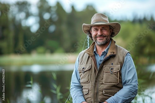Lighthearted Fisherman Wearing a Vest and Hat, Lake Scene Behind, Room for Text
