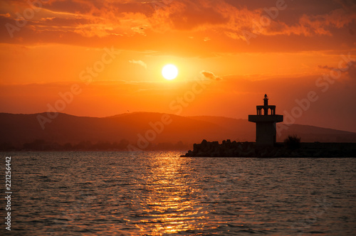 Lighthouse against a beautiful evening sunset on the sea. Amazing sunset on black sea and beautiful cloudscape.