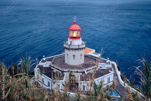 azores, ocean, lighthouse, coast, travel, scenic, building, tower, sky, coastline, light, portugal, europa, shore, landmark, island, atlantic, tour tourism, architecture, landscape, navigation, trip, signal, aid, cliff, scenery, sea, house, portuguese, hill, view, water, point, archipelago, historic, shine, nature, background, old
