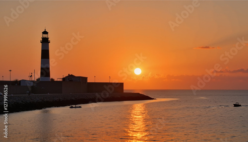 Lighthouse guiding boats at sunset, serene coastal ambiance