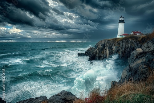 lighthouse, crashing waves, ocean, dramatic sky, cloudy, nature, coastal, stormy, landscape, water, turbulent, foam, spray, beacon, maritime, coastline, sea, wave, powerful, scenic, rough sea, navigation, shoreline, rugged