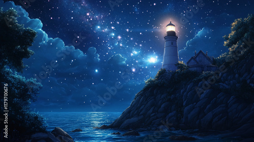 island, sea, night, house, light, sky, lighthouse, starry, coast, space, travel, earth, design, navigation, dark, tower, scenery, view, isolated, summer, blue, rocky, illustration, harbor, vector, panoramic, seacoast, building, beach, image, nature, ocean, signs, cartoon, background, scene, seascape, shore, water, beacon, cliff, flat, landscape, nautical, marin, coastline, graphic, skyline