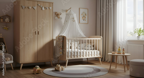 Light-wood nursery with baby crib and accessories. A neutral-toned room features a crib with a canopy, adorned with soft toys. Parent, interior designer, nursery. modern home.