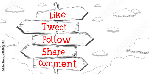 like, tweet, follow, share, comment, cyberspace, communication, post, signpost, crossroad, arrow, guidepost, wooden, signs, direction, sky, cloud, 5, text, word, concept, pointer, illustration, white background, red