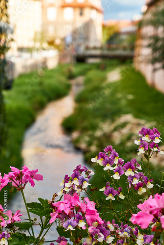 Lila blühende Blumen vor dem Bachlauf der Schwabach in der Altstadt Schwabach, Deutschland