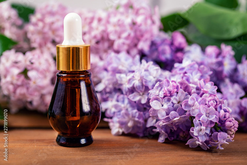 lilac essential oil bottle with blooming lilac branch