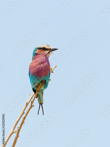 Lilac-Breasted Roller (Coracias caudatus) perched at the end of a small twig, taken in South Africa
