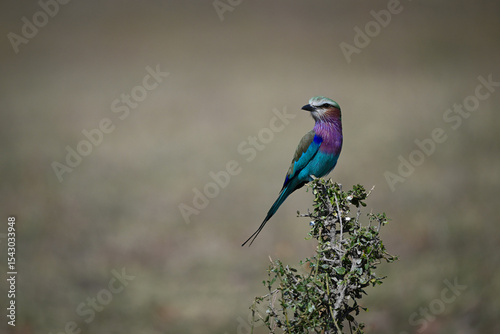 Lilac-breasted roller turning head on leafy bush