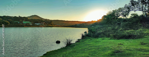 Linda vista de lagoa em final de tarde ensolarada, situada na região de Jardim das Oliveiras Esmeraldas, Minas Gerais, Brasil.