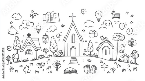 line art drawing of Christian religious icons such as jesus christ, bible and church elements