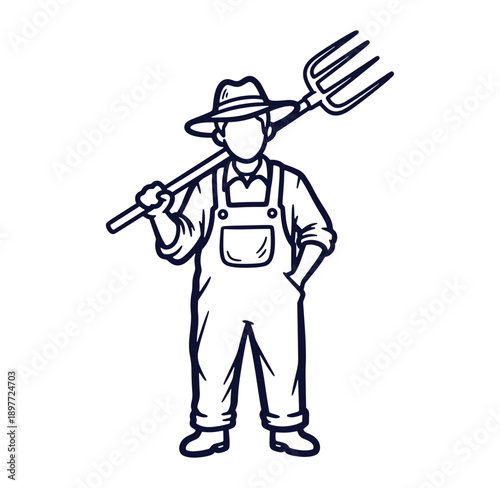 Line art illustration of a farmer holding a pitchfork representing agricultural work and farming