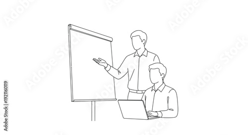 presentation, meeting, business, vignetting, drawing, outline, monochrome, colleague, laptop, technology, office, work, communication, team, discussion, male, man, person, professional, corporate, teaching, learning, leader, speaker, audience, project, strategy, planning, report, analysis, modern, simple, minimalist, diagram, whiteboard, projector, screen, digital, innovation, idea, concept, collaboration