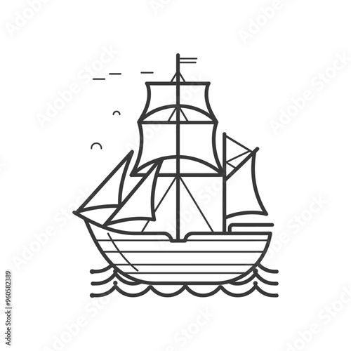Line Art Illustration of a Sailing Ship with a Flag