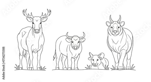 Line art illustration of diverse ungulates, including a deer, cow, bull, and calf, perfect for educational resources or creative projects
