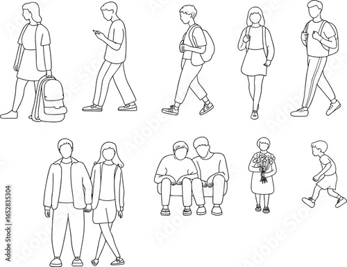 Line drawing vector illustration of people walking, sitting, standing, holding hands, carrying backpacks, minimal outline sketch, cad drawing figure