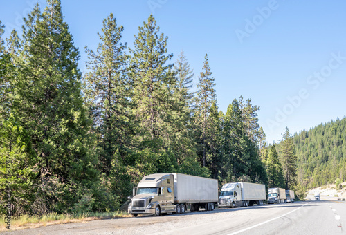Line of the big rigs semi trucks with semi trailers standing on the road shoulder for truck drivers rest.