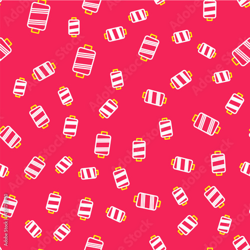 Line Sewing thread on spool icon isolated seamless pattern on red background. Yarn spool. Thread bobbin. Vector