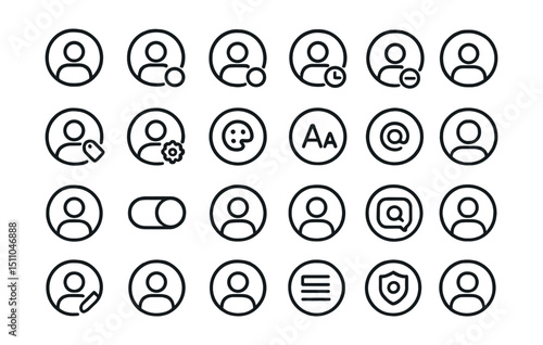 Line style icons of round user and profile settings in chat: round avatar icon, round profile status, round online icon, round away badge, round DND icon, round custom name, round user settings,
