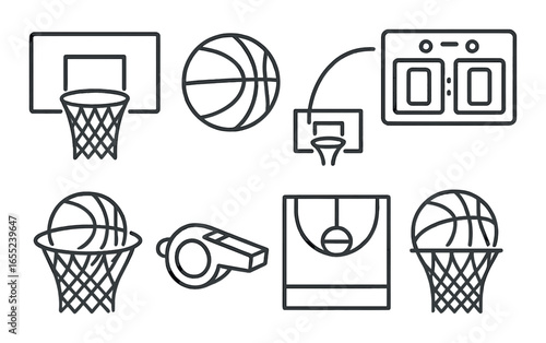 Linear basketball icon set featuring hoop, ball, court, backboard, whistle, and scoreboard symbols