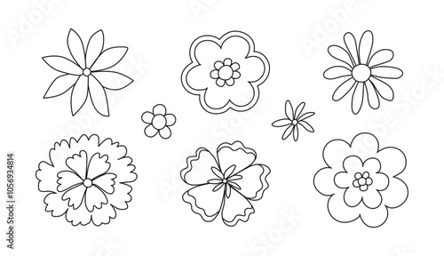 Linear groovy flowers icons. Retro vintage blossoms. Hippie daisy stickers. Flower power. Line art botanical sketch, drawing. 60s, 70s, 80s. Vector isolated on white.