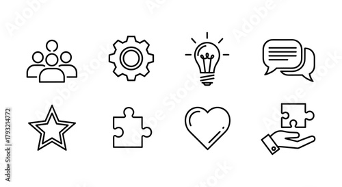 Linear icons: teamwork, innovation, communication, heart, puzzle, gear, star