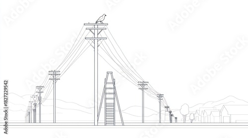 Linear illustration depicts a line of power poles and a ladder beneath an eagle perched atop a pole