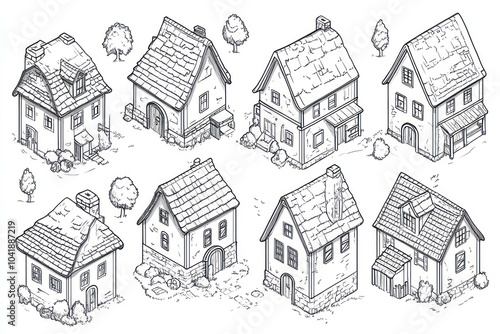 line-art, clip-art style , european medieval city separate buildings, black and white illustrations, isometric view, no backgrounde, clean thick lines with few details, coloring page.