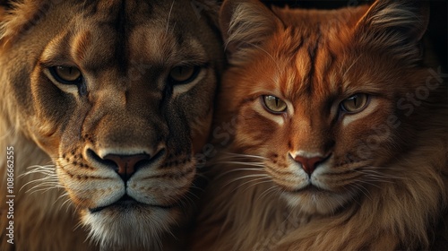 Lion and domestic cat half face comparison, strength vs. gentleness