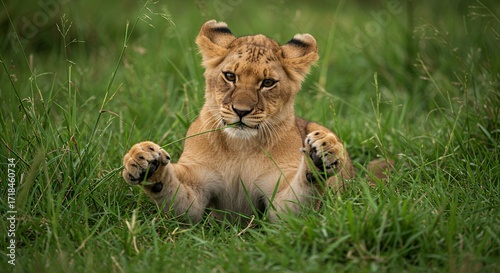 baby animal, lion, wildlife, nature, grass, meadow, animal, mammal, young, brown, green, day, natural light, photo, image, conservation, fauna, wild animal, africa, savanna, grassy, lying, resting, cute, adorable, closeup, portrait, horizontal, vertical, copy space, isolated, high-quality, royalty free, stock