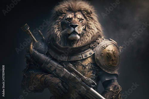 Lion dressed as a warfare soldier holding a gun. Generative AI.