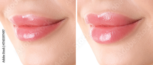 Lip augmentation, collage. Woman showing her lips before and after cosmetic procedure, closeup