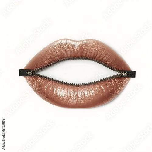 Lips are depicted with a zipper in place of the opening, symbolizing silence or being zipped up.