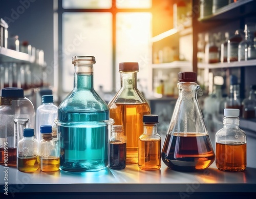 Liquid chemicals and waste bottles in a chemistry lab