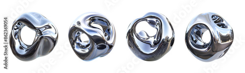 Liquid chrome ring shapes set, metallic fluid blobs. Abstract, futuristic metal form reflection effect.