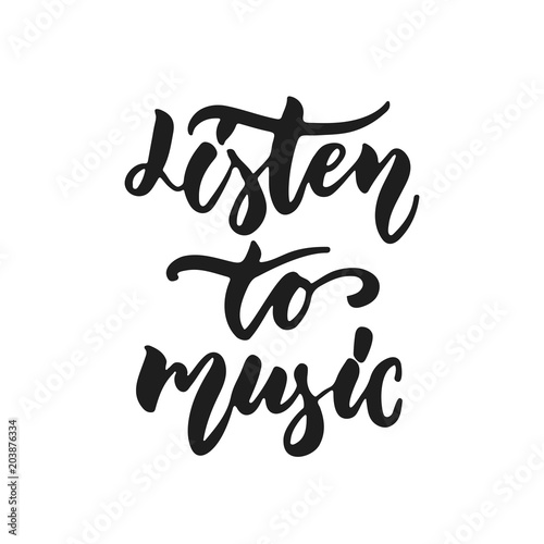 Listen to music - hand drawn lettering quote isolated on the white background. Fun brush ink vector illustration for banners, greeting card, poster design, photo overlays.