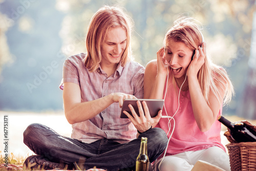 couple, human relationships, happiness, listening, music, earphones, tablet, beer, park, picnic, cheerful, lifestyle, summer, spring, love, enjoyment, man, friendship, romance, outdoors, woman, people, sun, casual clothes, dating, two people, flirting, recreational pursuit, laughing, smiling, embracing, adult, young adult, avocation, photo