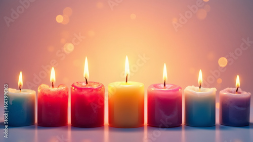 candle, lit candle, flames, wax, glowing, warm, soft, bokeh, background, holiday, celebration, birthday, anniversary, faith, spirituality, light, colourful, row, arrangement, event, decoration, festive, illumination, vibrant, studio, closeup, horizontal, no people, peace