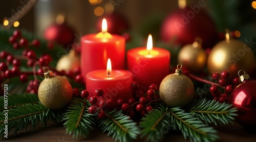 Lit red candles surrounded by evergreen branches and berries, creating a cozy holiday atmosphere