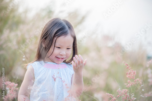 Little asian girl playing with wild flower in field