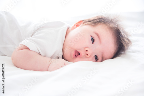Little asian infant waking up on white bed in the morning