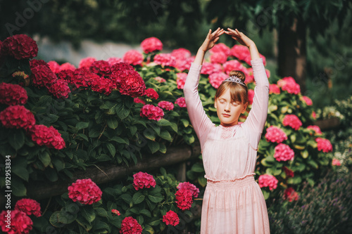 Little ballerina girl dancing in hydrangea garden, wearing tutu dress