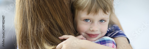 Little beautiful girl hugs her mother and smiling portrait. Social guarantees for women with children during divorce concept.