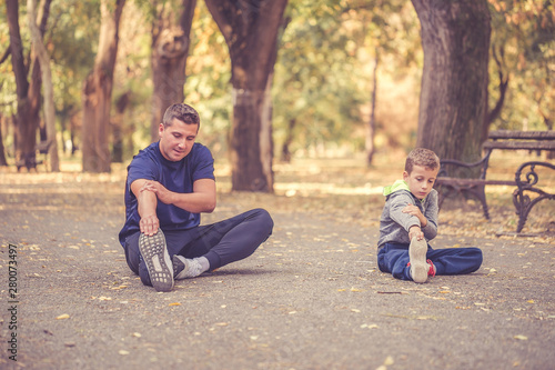 Little boy and his father doing stretching exercise together in the park