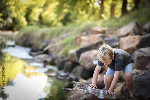 Little boy climbing on and exploring rocks at riverside of Castlereagh River in Coonabarabran, New South Wales, Australia
